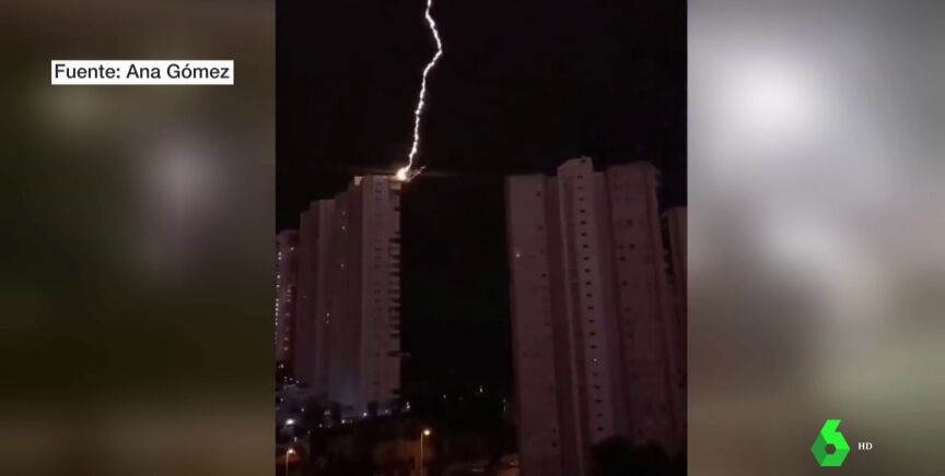 Una vecina que grababa con su teléfono móvil la tormenta eléctrica logró capturar el momento en el que uno de los rayos golpeó la azotea de un edificio de 30 plantas. Las increíbles imágenes han sido difundidas por el Laboratorio de Climatología de la Universidad de Alicante.