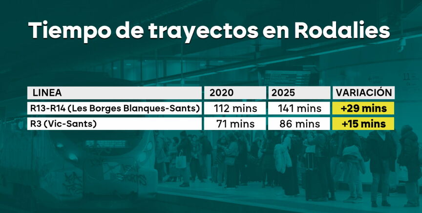No es la única línea que ha visto aumentado los tiempos de trayecto y sus paradas. La R13 y la R14, que conectan Les Borges Blanques en Lleida con la capital catalana registran un incremendo de casi media hora; la R3, la de Vic, uno de un cuarto de hora con tres paradas más.
