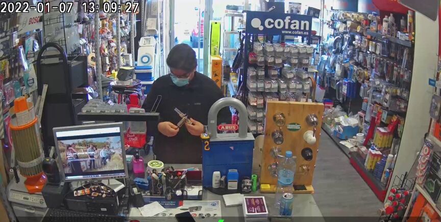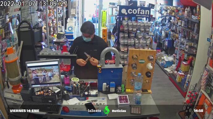 En las imágenes que acompañan esta información vemos cómo actúa. Su última estafa ha sido en una ferretería de Móstoles. Entra contando que trabaja en un taller mecánico de la misma calle, para comprar material. Entabla conversación con la dependienta. Es afable, inspira confianza. Da detalles (falsos) que le ubican como uno más del barrio.
