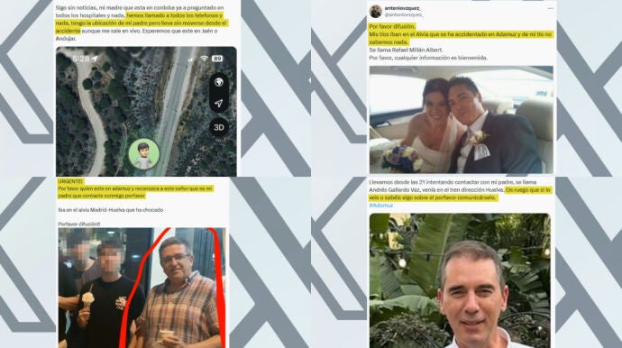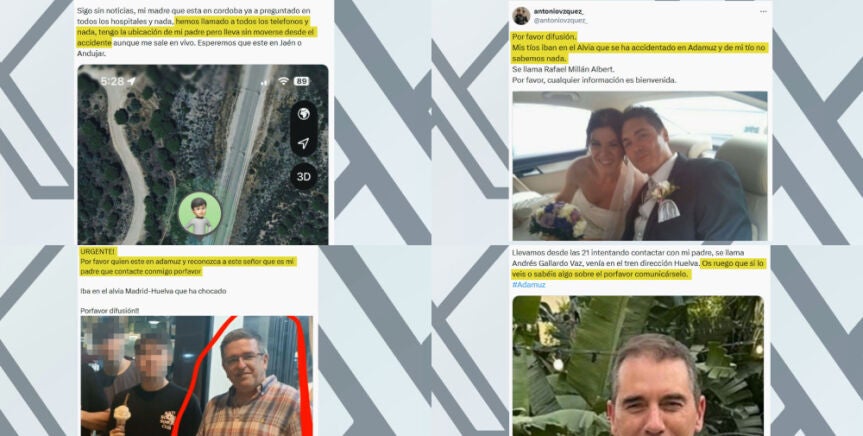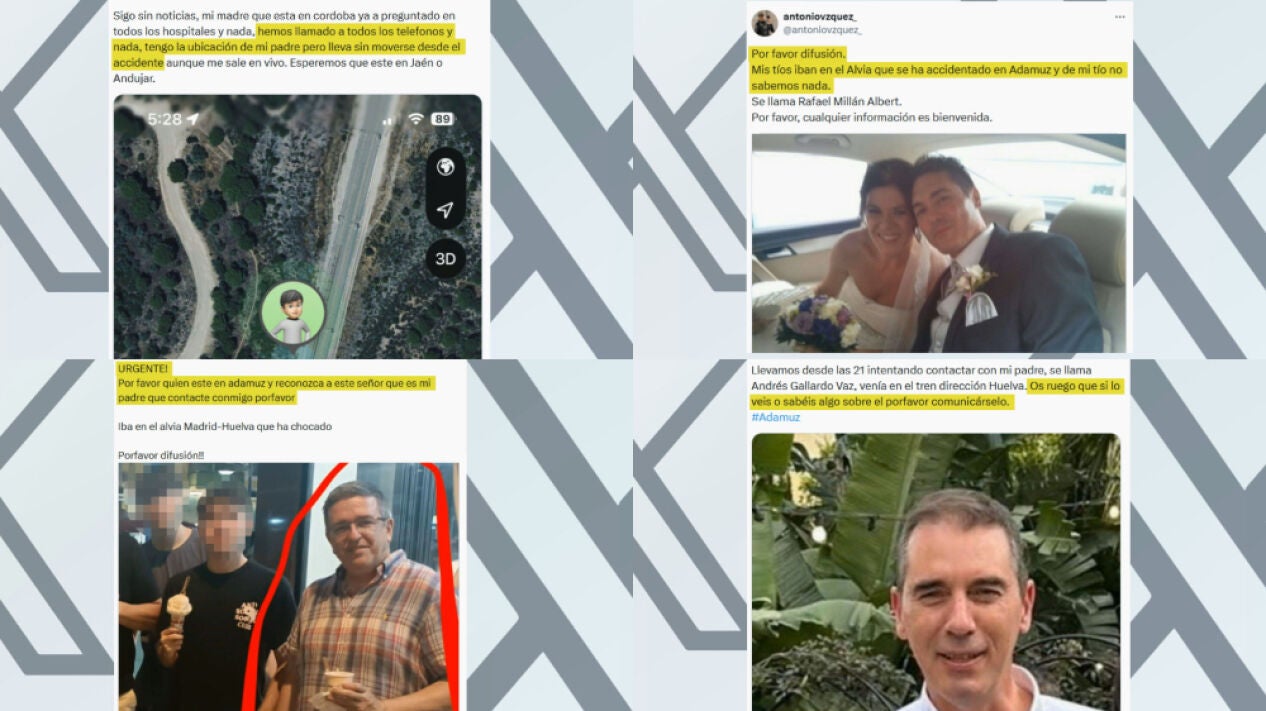 Tras el accidente ferroviario en Adamuz (Córdoba), las redes sociales han sido cruciales para las familias afectadas. Con las líneas telefónicas saturadas, Emergencias Andalucía y Cruz Roja instaron a los sobrevivientes a comunicar su estado a través de redes sociales o WhatsApp, aliviando así la preocupación de los familiares. Actualmente, 39 familias siguen sin noticias de sus seres queridos, como María Eugenia, Miriam, Ricardo y otros.