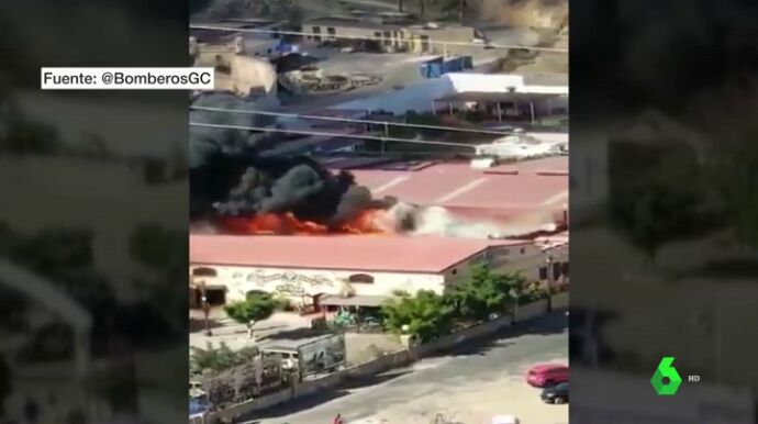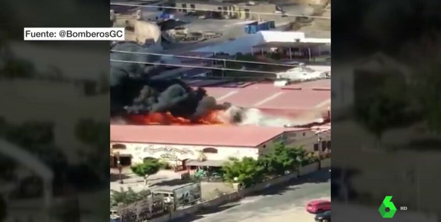 Un espectacular incendio originado en un local junto al parque acuático Aqualand Maspalomas en San Bartolomé de Tirajana (Gran Canaria), ha obligado a evacuar a los bañistas que se encontraban en el parque por su seguridad.