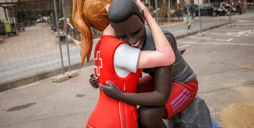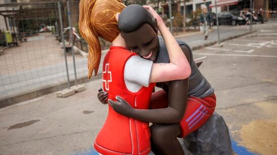 La escena humanidad en la que una voluntaria de Cruz Roja y un migrante subsahariano se fundían en un abrazo en mayo de 2021, una de las protagonistas de las Fallas de Valencia.
