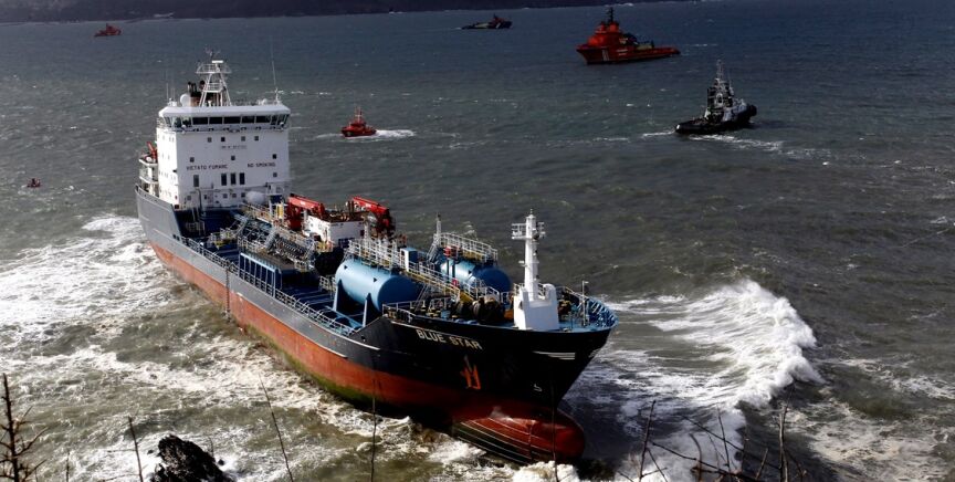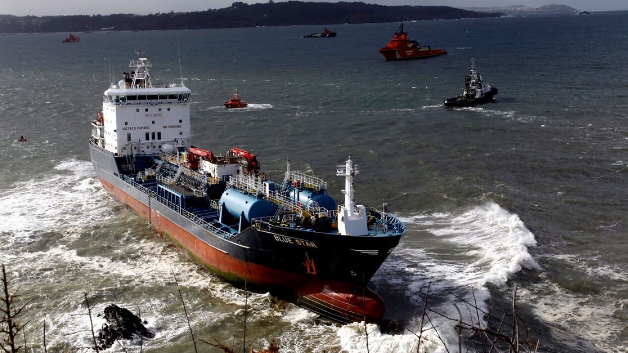Suspenden el tercer intento para desencallar el petrolero Blue Star de la zona de rocas de Ares, A Coruña
