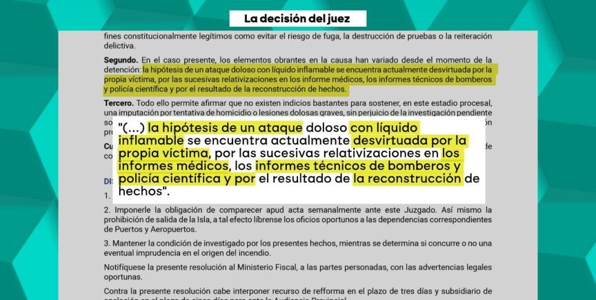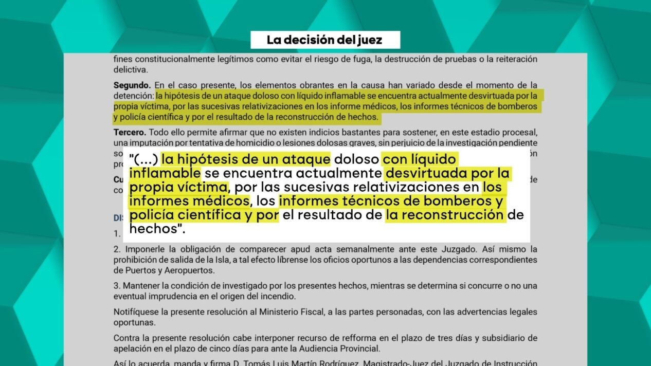Además, hay un vídeo en el que ambos salen de la casa y se abrazan. Gesto que según el juez, revela cooperación para escapar de las llamas. Por tanto, la hipótesis del ataque con liquido inflamable queda descartada. Según el juez, "por la propia víctima, por los informes médicos, los informes técnicos de bomberos y policía científica y por la reconstrucción de los hechos". Se consolida, por tanto, que el incendio su produjo de manera accidental.