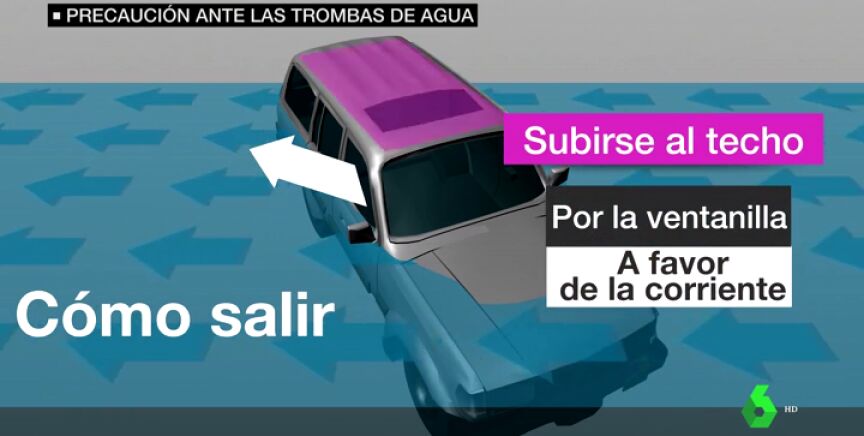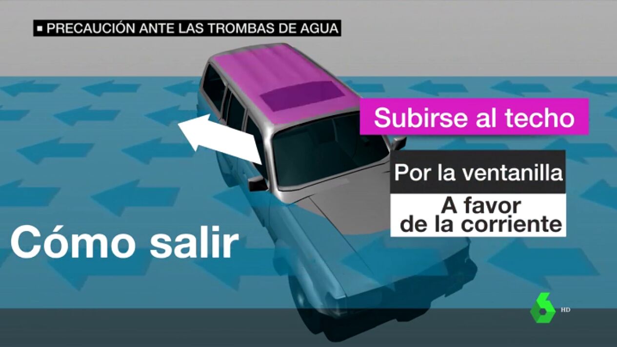 Siempre hay que salir por la ventanilla contraria a la corriente de agua. A continuación, una vez fuera, hay que subirse al techo del vehículo.