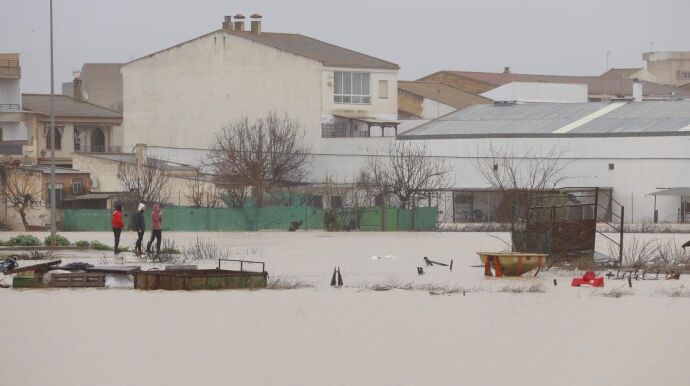 En Pinos Genil, solo se puede ver el larguero de la portería del campo de fútbol tras quedar completamente inundado. Con carretillas y escobas, los vecinos de Pinos Genil, achican todo el agua que pueden e intentan quitar el barro que ha entrado en el interior de sus viviendas.