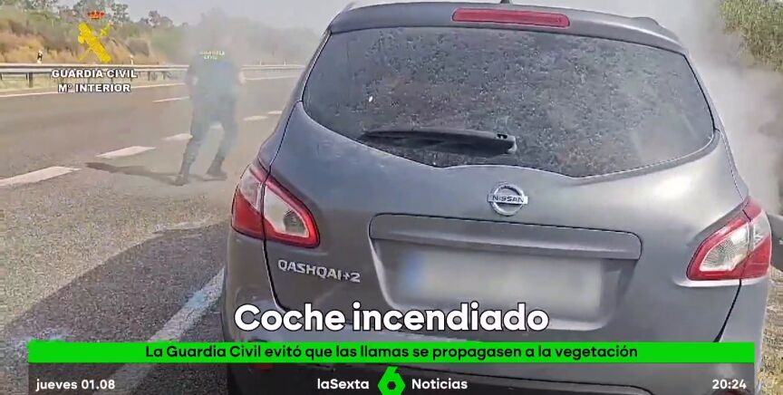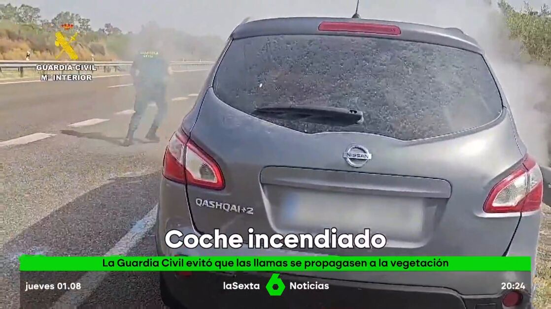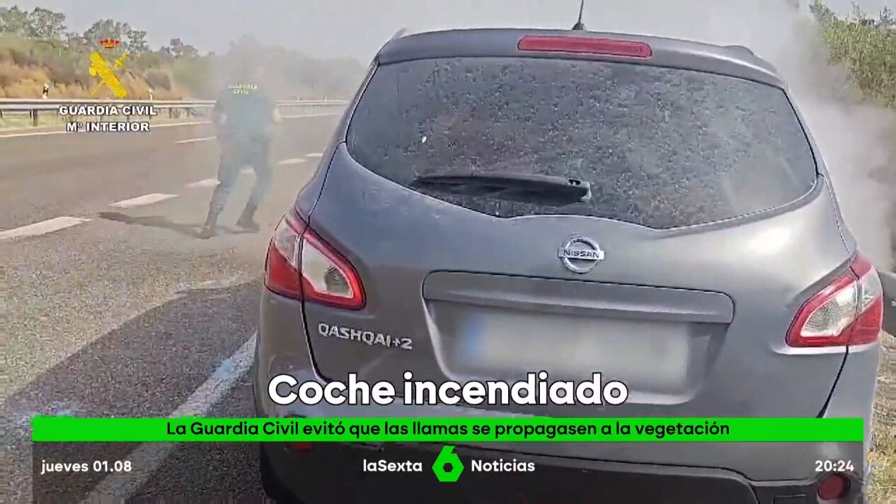 La rápida actuación de unos guardias civiles con un coche con el motor en llamas ha evitado una tragedia. El vehículo empezó a arder cuando circulaba por una carretera de Sevilla. Dentro viajaba una familia.