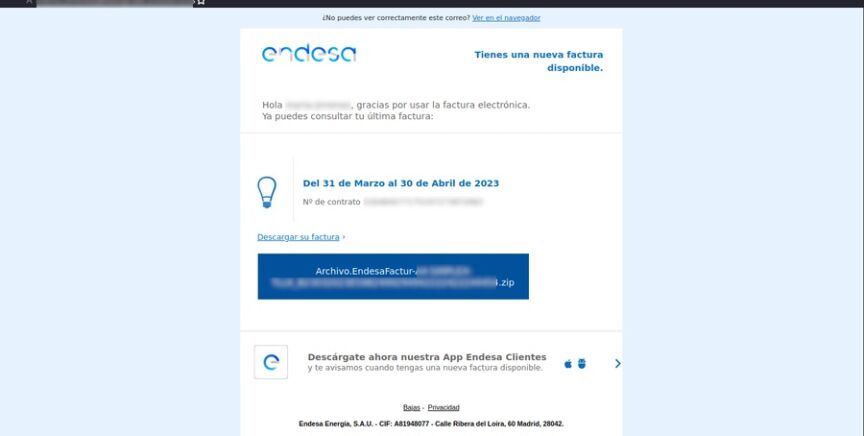 Los ciberdelincuentes suplantan a Endesa con una factura falsa e instalan en tu dispositivo un archivo con contenido malicioso.