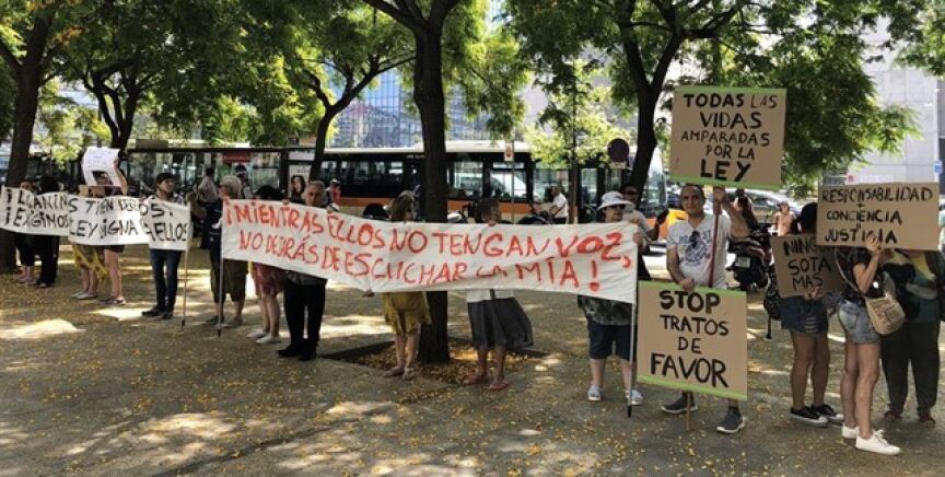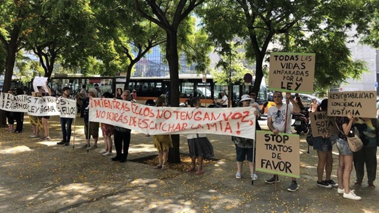 A las puertas de la Ciutat de la Justicia, se han concentrado esta mañana una treintena de animalistas en protesta por la actuación policial, con pancartas con lemas como "Justicia para Sota", "Los animales tienen derechos, exigimos una ley digna para ellos" o "Mientras ellos no tengan voz, no dejaras de escuchar la mía".