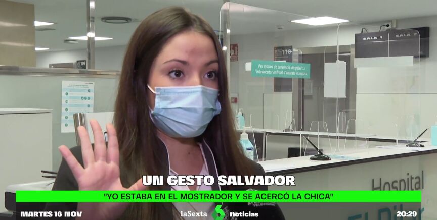 La mano abierta, el pulgar hacia dentro y los cuatro dedos encima. Este gesto ha salvado a una mujer de su maltratador. Ha sido en Barcelona, en la sala de espera del Hospital El Pilar. LaSexta ha hablado con una de las trabajadoras de este centro médico que reconoció este gesto de socorro, y nos ha contado el nerviosismo con el que la víctima lanzó su mensaje. Ella estaba en el mostrador al que se acercó la joven cuando se produjo el aviso.