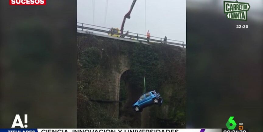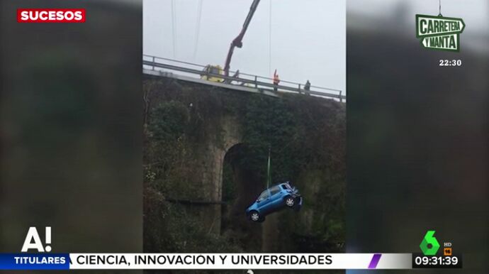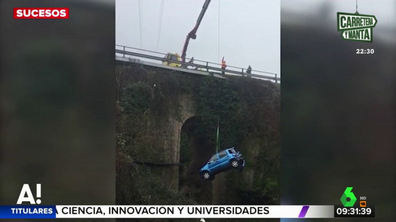 Después del accidente, ha sido necesaria una grúa de gran tonelaje para izar el coche hasta la carretera desde la que había caído.
