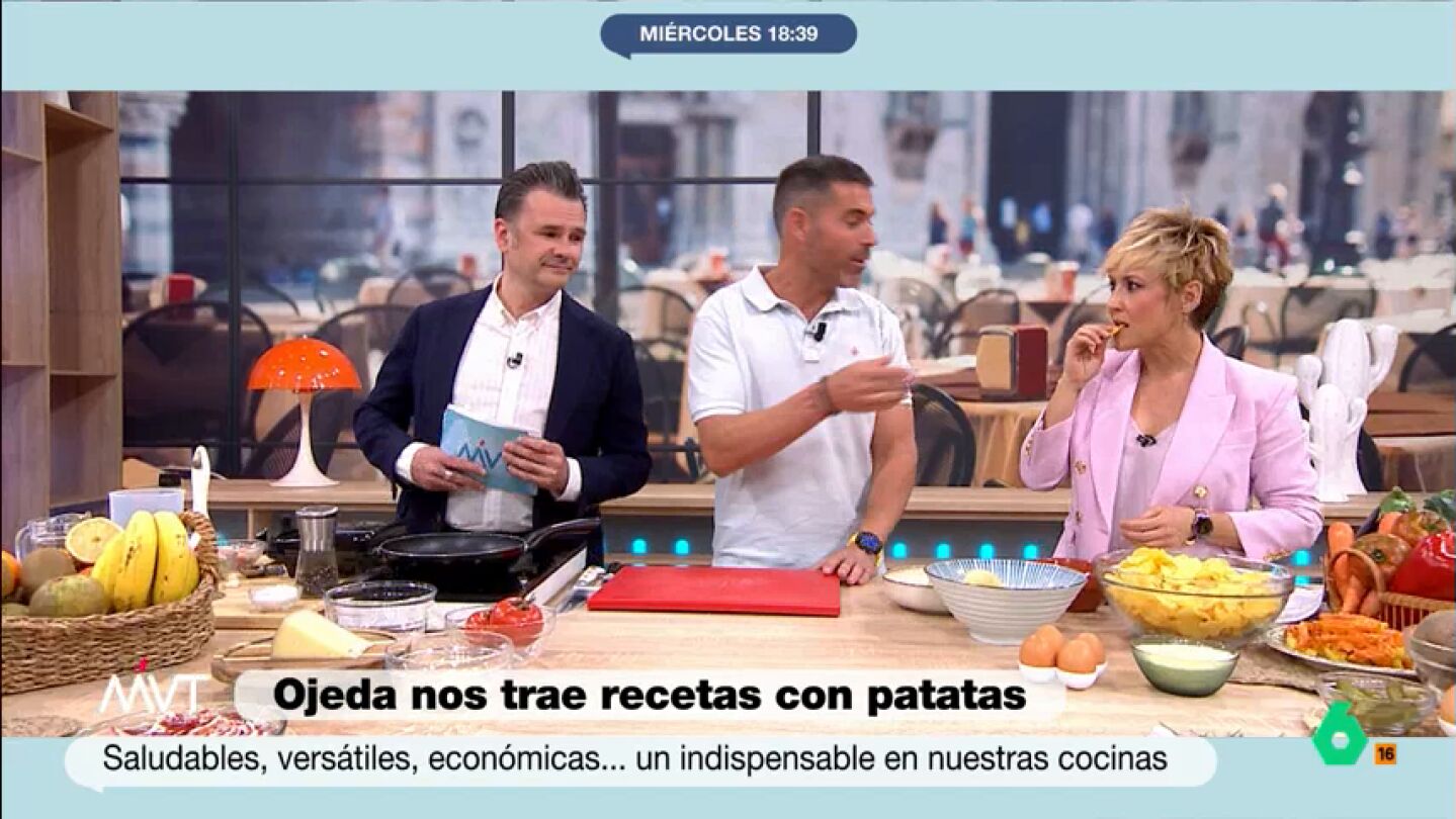 El presentador del programa decide 'desvelar' el truco que han usado sus compañeros de producción para que Cristina y él no se coman el plato de patatas bravas: "Nos las traen frías". Cristina, por su parte, pregunta por otra presentación de patatas: las de bolsa. Ojeda indica que no es partidario de esa presentación. "Tiene muchísimos aditivos y, entonces, no es lo mejor", concluye.