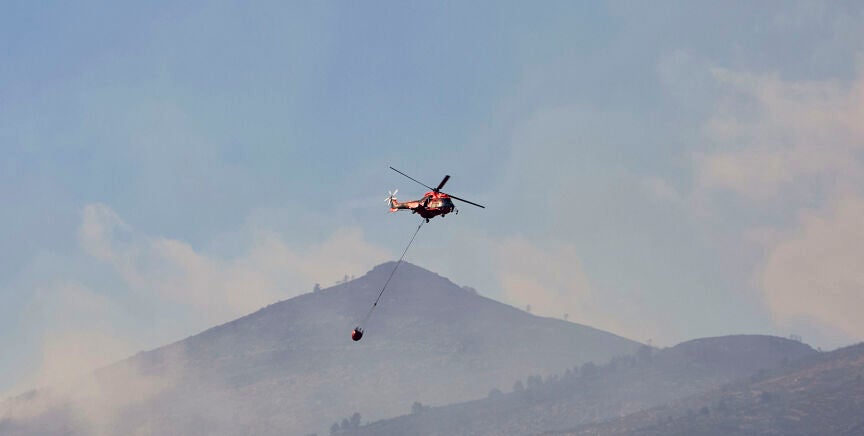 El incendio declarado este jueves en Montitxelvo (Valencia) ha quemado ya 2.580 hectáreas y alcanza un perímetro de 38 kilómetros, y aunque las condiciones meteorológicas siguen siendo adversas se ha logrado que el fuego no haya pasado a la provincia de Alicante y a la Sierra de Mariola.
