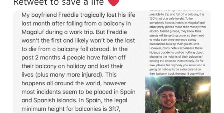 Mia Smith, la novia de un joven británico que murió tras caerse por el balcón de su habitación en Magaluf, culpa a los hoteles del accidente por poner barandillas demasiado bajas que, asegura, parecen estar "esperando un accidente". La chica ha acudido a Twitter para denunciar lo que considera una irresponsabilidad por parte de los establecimientos, quienes "hacen dinero" a partir de "grupos animados con alcohol".