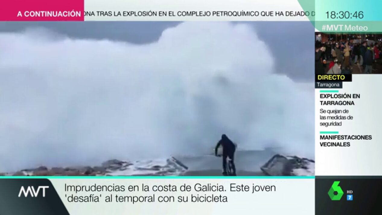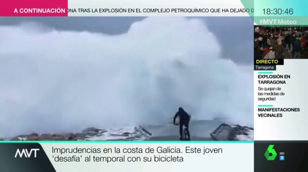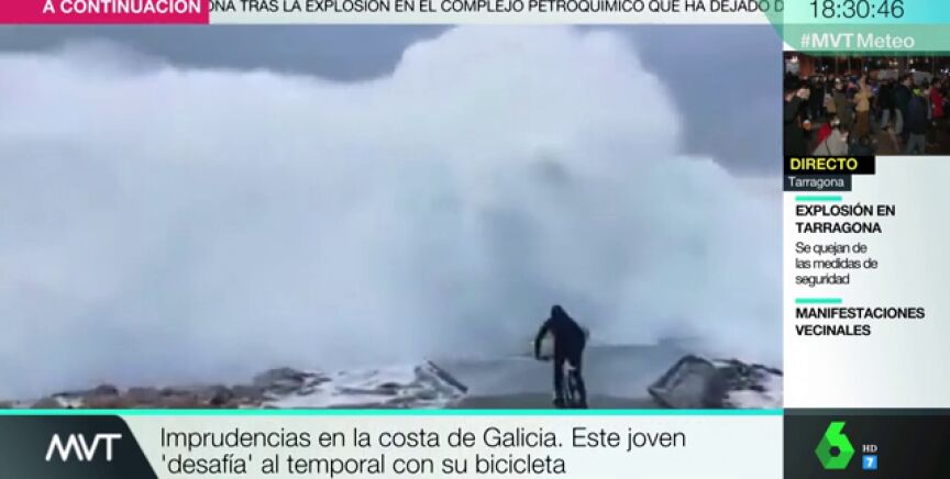 Un joven en bicicleta reta a las olas en plena alerta naranja por el temporal en la costa gallega. Una imprudencia que podría haberle costado muy cara y que ha despertado la indignación.