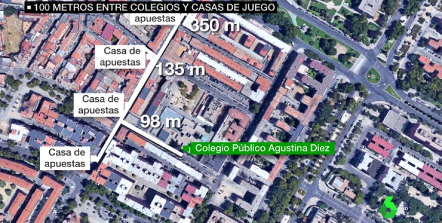 El colegio público Agustina Díez está en uno de los distritos con más casas de apuestas de Madrid, con cuatro en menos de 350 metros. "He visto entrar en estos lugares a menores de 15 y 16 años", cuenta un vecino.