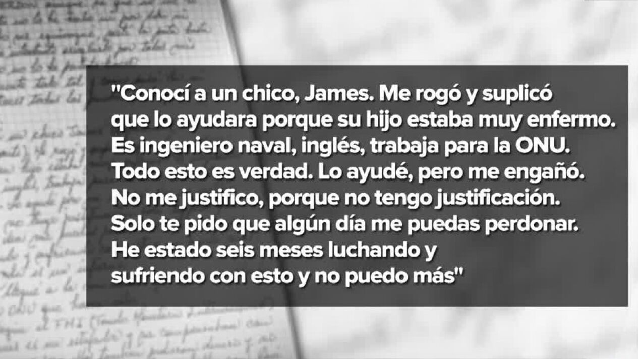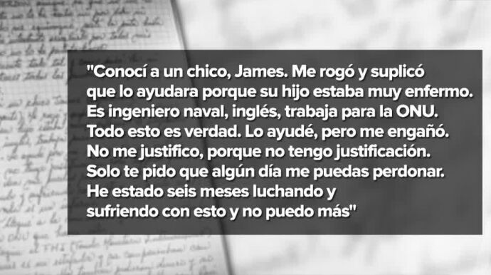 En todo momento deja claro que su suicidio no es por la situación de su hija y su nieta sino por una estafa de 100.000 euros por parte de un hombre que le dijo que trabajaba en la ONU y que necesitaba dinero para cuidar de su hijo enfermo.