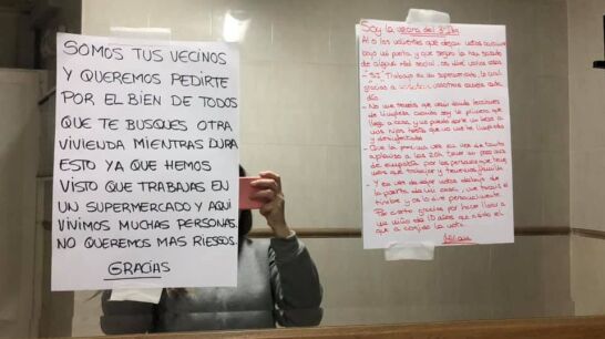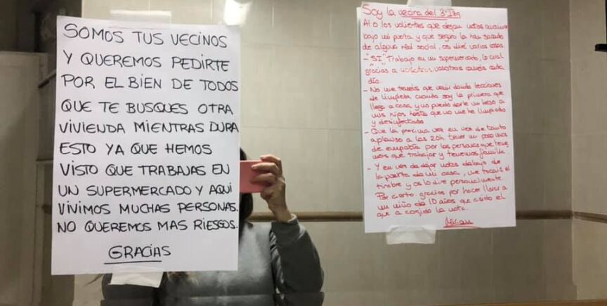 "Somos tus vecinos y queremos pedirte por el bien de todos que te busques otra vivienda mientras dure esto ya que hemos visto que trabajas en un supermercado y aquí vivimos muchas personas y no queremos más riesgos. Gracias", dice la nota que alguien de su comunidad ha dejado de manera anónima bajo la puerta de su domicilio.