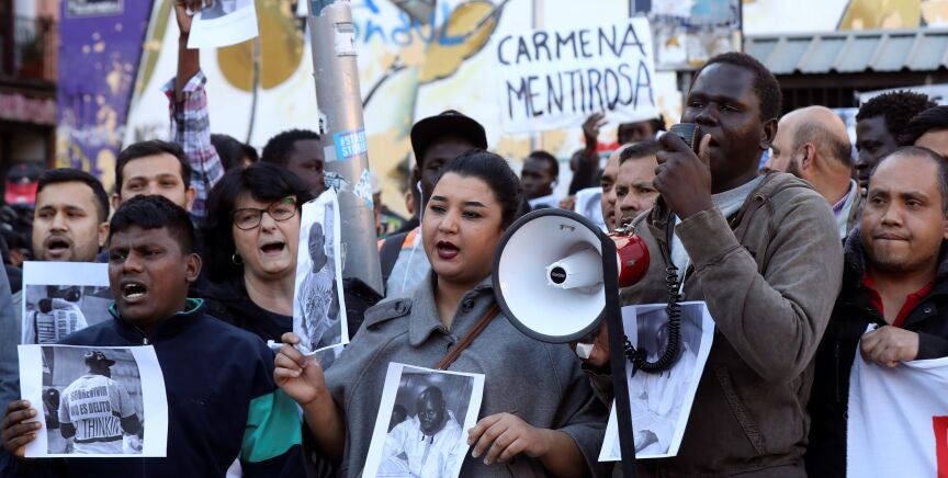 Concentración en el barrio madrileño de Lavapiés en memoria de Mame Mbaye, el mantero senegalés que murió hace un año tras una persecución policial. El sindicato de manteros ha denunciado la Ley de Extranjería y la situación que muchos de ellos viven cada día.