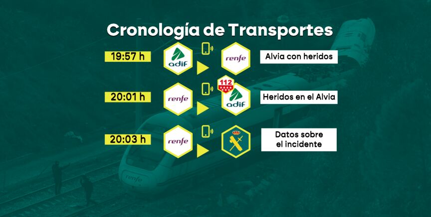 El Ministerio que dirige Óscar Puente ha difundido la secuencia cronológica de las llamadas, tras la publicación de informaciones que apuntan a que los viajeros del Alvia no tuvieron asistencia hasta mucho después del accidente. Esta cronología evidenciaría que sí se comunicó entre los distintos equipos de emergencias desde los primeros momentos que había también un Alvia afectado.