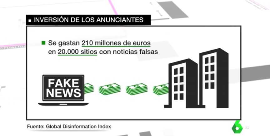 Los anunciantes se gastan de media 210 millones de euros en mas de 20.000 sitios con noticias falsas, y su reputación corre peligro. Titulares sensacionalistas, con frases impactantes, que provocan la atención del usuario de Internet que entra en la página generando beneficios a los dueños de las webs. Es el negocio de la manipulación digital.