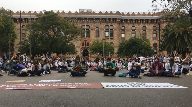 La médicos MIR de Cataluñahan cortado la céntrica avendia Diagonal de Barcelona a la altura de Palau Reial en su octavo día de huelga para después dirigirse con la protesta hasta la Consellería de Salut, donde han realizado una sentada.