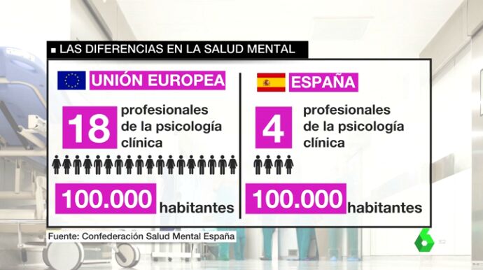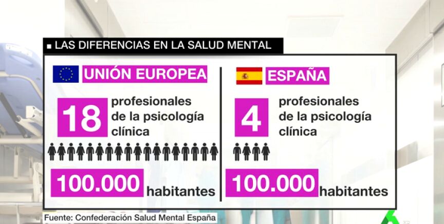 Desde la Confederación Salud Mental España aseguran que la salud mental es la "hermana pobre" del sistema sanitario español. La media europea está en 18 profesionales de psicología clínica cada 100.000 habitantes. Sin embargo, nuestro país solo cuenta con 4 profesionales por cada 100.000 habitantes.