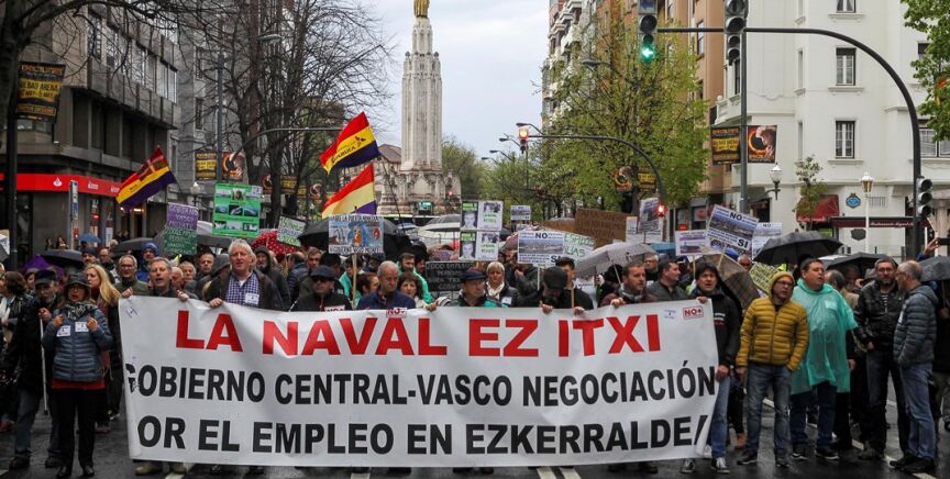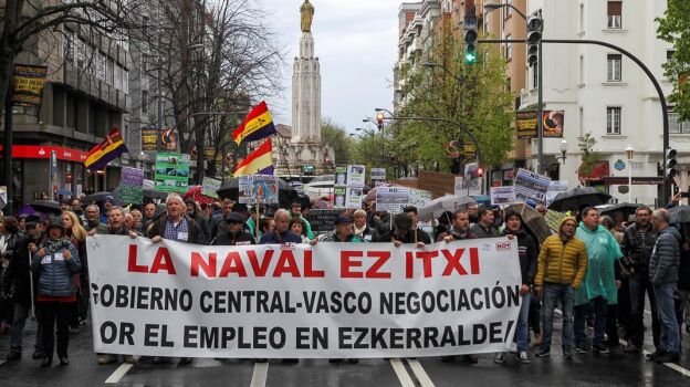 En la movilización, que ha recorrido las principales calles de la capital vizcaína, encabezada por un grupo de trabajadores que portaban maletas y una pancarta en la que se podía leer 'La Naval ez itxi. Gobierno central-vasco negociación', los participantes han coreado gritos como 'Para Europa sí es legal, que se compre La Naval'.