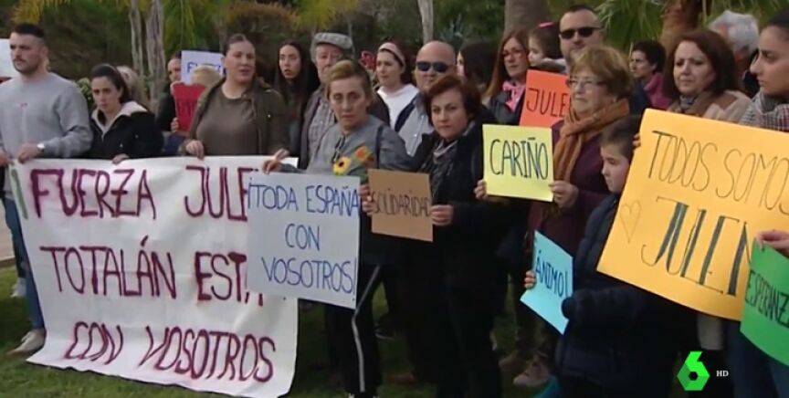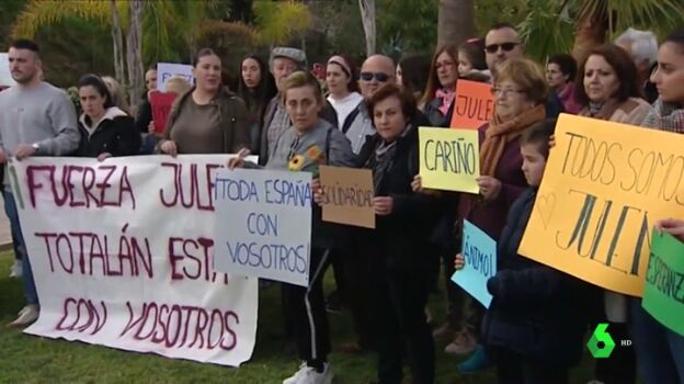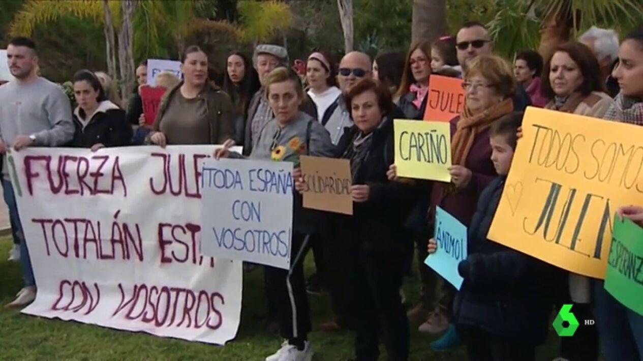 Con pancartasy dibujos hechos por los niños del pueblo se han concentrado los vecinos de Totalánpara mostrar su apoyo a la familia de Julen.