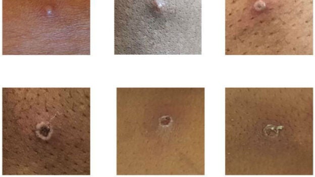Los síntomas son fiebre, escalofríos, adenopatías inguinales pero lo que más complica la enfermedad son las lesiones cutáneas que produce en la cara y en las manos.