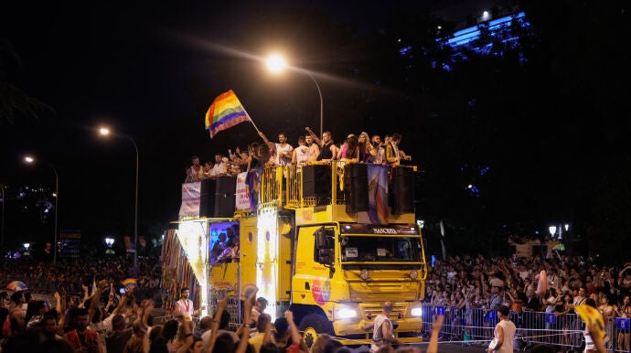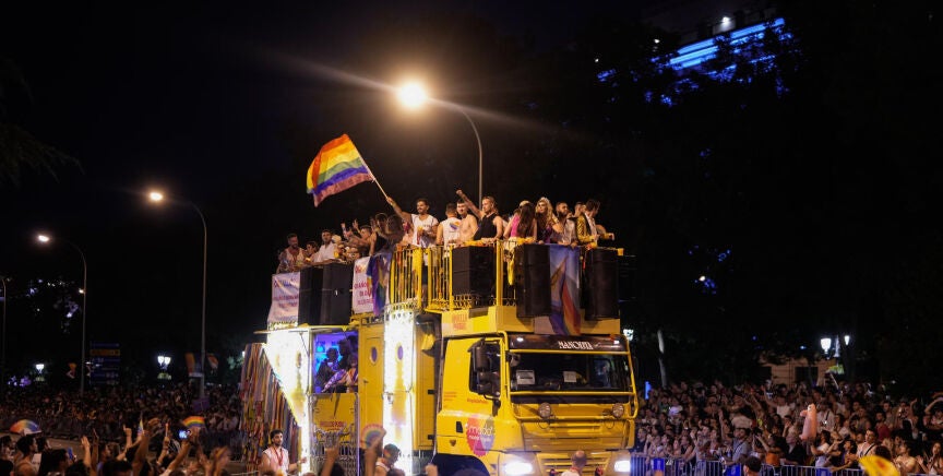 Madrid ha vuelto a tomar las calles bajo la sombra de miles de banderas arcoíris. El centro de la capital española se ha vuelto a convertir, un año más, en el epicentro del Orgullo LGTBIQ+ en una manifestación que ha aglutinado a miles de personas -250.000 según la delegación del Gobierno y 1.000.000 según fuentes de la organización- y como colofón de una programación festiva y reivindicativa que este año se ha centrado en celebrar el 20 aniversario del matrimonio igualitario.