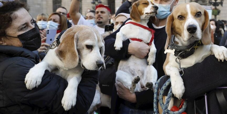 Manifestación en Barcelona para liberar a 32 cachorros de perros 'beagle' que podrían ser sacrificados en un experimento