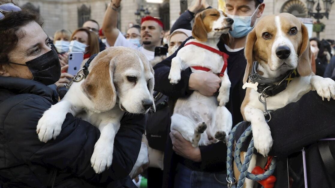 Cerca de 450 personas, según la Guardia Urbana de Barcelona, se han concentrado este sábado en la plaza Sant Jaume en protesta por la experimentación con una treintena de cachorros de perros 'beagle', que podrían acabar sacrificados, en un proyecto de investigación farmacológico del laboratorio Vivotenia.
