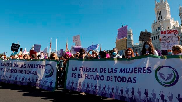 La marcha ha comenzado a las 12.00 horas en la madrileña plaza de Neptuno y ha concluido en la Puerta del Sol, bajo el lema 'La Fuerza de las mujeres es el futuro de todas' para reivindicar los derechos de la mujer. "¡Qué viva, la lucha de las mujeres!, ¿Dónde está la ministra de Igualdad?", han coreado las manifestantes durante la concentración.