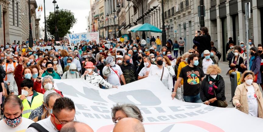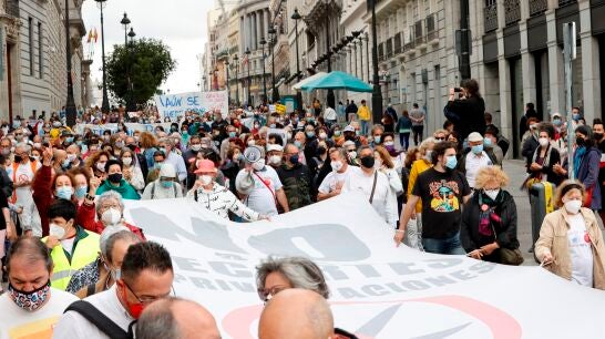 Con el lema 'Ayuso desmantela la Atención Primaria', los manifestantes han recorrido el centro de la capital denunciando las múltiples dificultades que sufren los pacientes para poder pedir una cita presencial o la marcha de muchos médicos a otras comunidades autónomas.