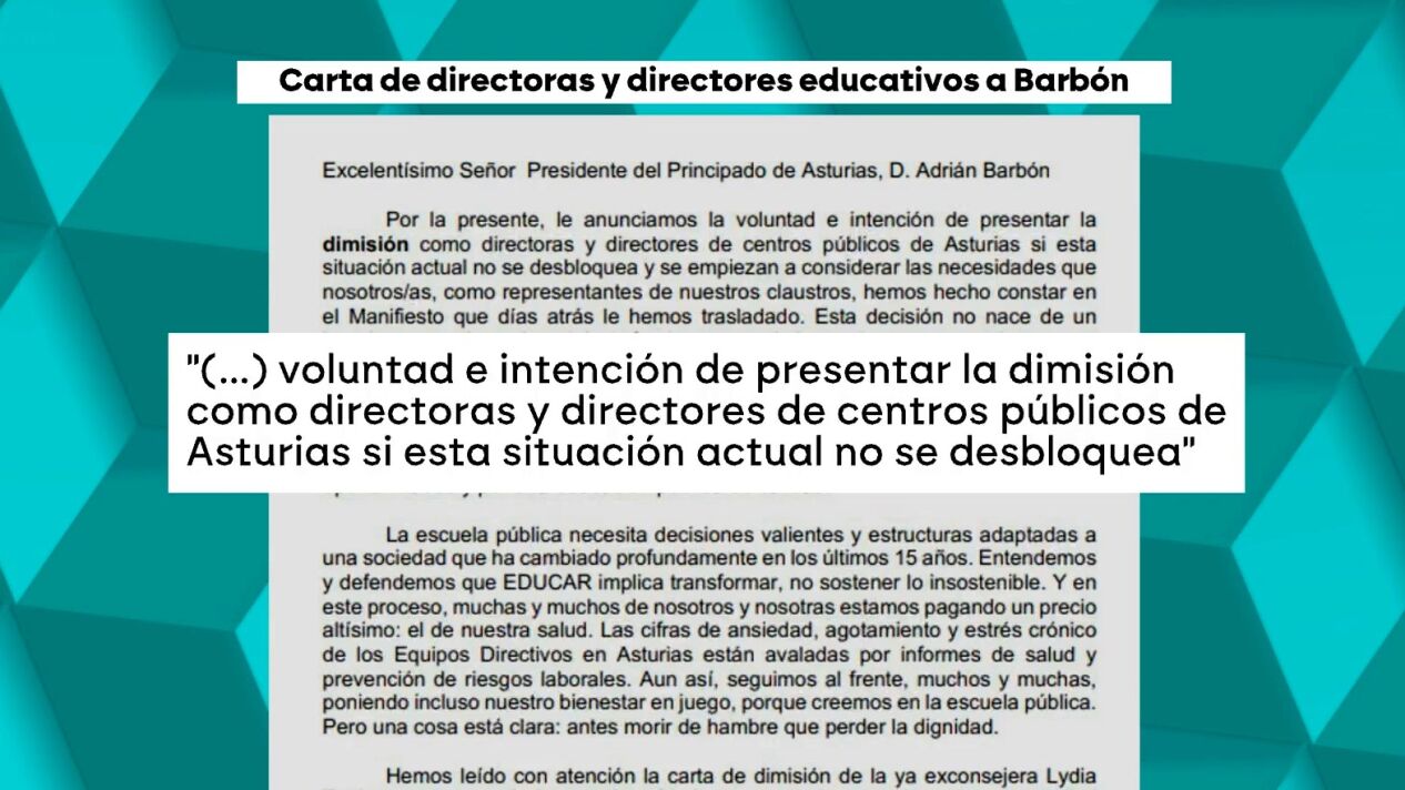 "Le anunciamos la voluntad e intención de presentar la dimisión como directoras y directores de centros públicos de Asturias si esta situación actual no se desbloquea y se empiezan a considerar las necesidades que nosotros, como representantes de nuestros claustros, hemos hecho constar en el Manifiesto que días atrás le hemos trasladado", recoge la carta a la que ha tenido acceso laSexta.