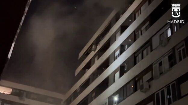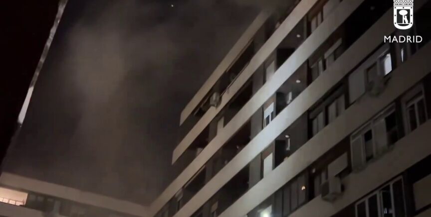 Trece dotaciones de los Bomberos de Madrid han extinguido el incendio y revisado vivienda por vivienda, tras lo que han ventilado la escalera y los pasillos, que se encontraban inundados de humo.