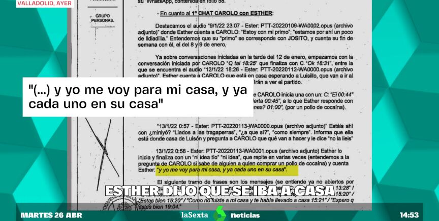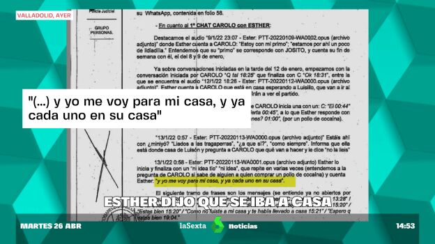 "Yo me voy para mi casa y cada uno en su casa". Es el mensaje que Esther López envió a su amigo Carolo a la 01:00 de la madrugada en la noche de su desaparición y que vuelve a poner en duda la versión de Óscar, el principal sospechoso de su muerte, que sostiene que la joven quería seguir de fiesta y él no.