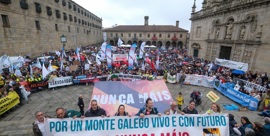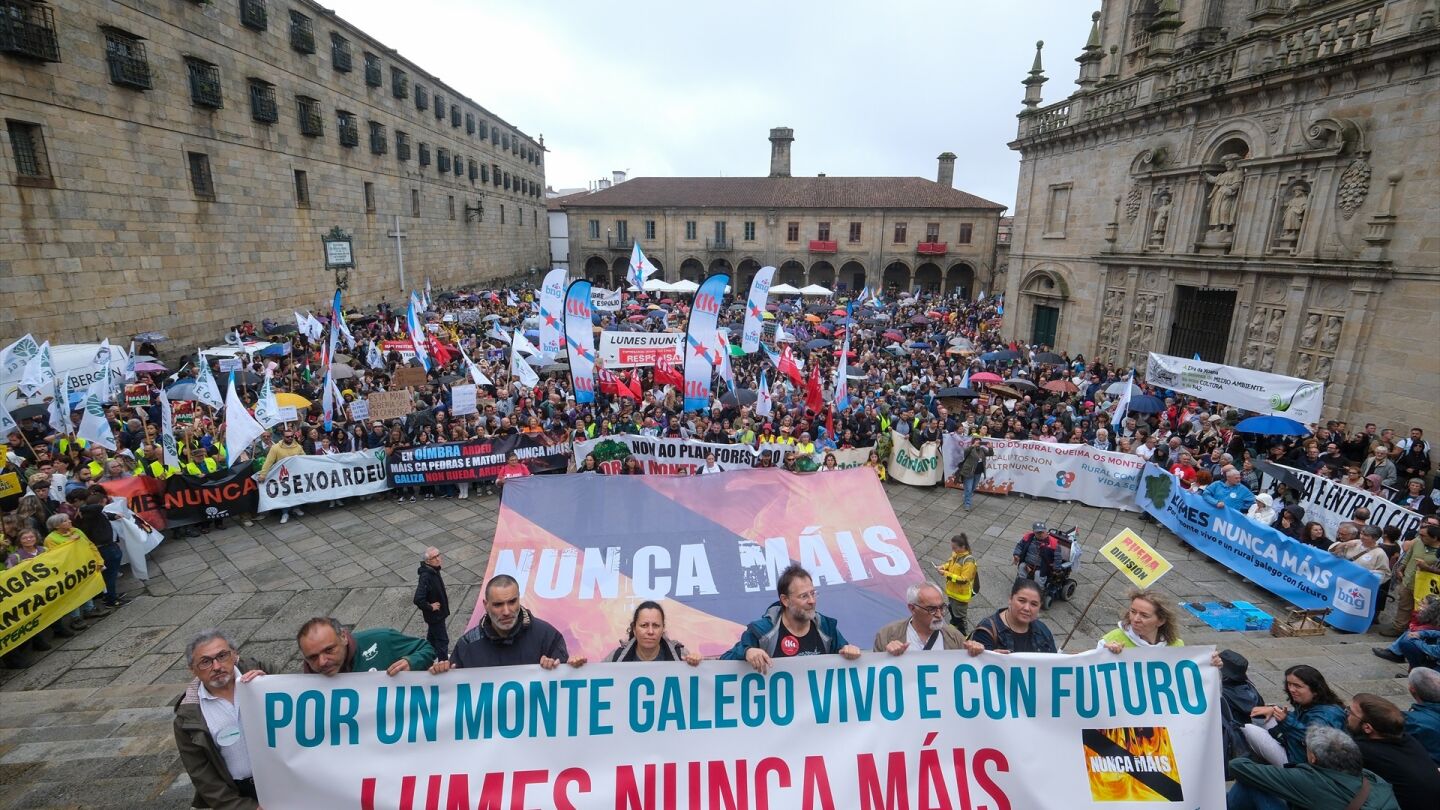 Miles de personas se manifestaron en Santiago de Compostela para criticar la política forestal de la Xunta tras los incendios que devastaron Galicia. Bajo el lema 'Lumes nunca máis', unas 20.000 personas marcharon desde la Alameda hasta la Praza da Quintana. Las críticas se centraron en la gestión del presidente de la Xunta, Alfonso Rueda, con pancartas pidiendo su dimisión. Durante la lectura del manifiesto, se exigieron "medidas urgentes" para prevenir futuros incendios y se pidió una moratoria indefinida del eucalipto. La elección de Santiago como lugar de la protesta fue criticada, sugiriendo que debería haberse realizado en Ourense, la provincia más afectada.