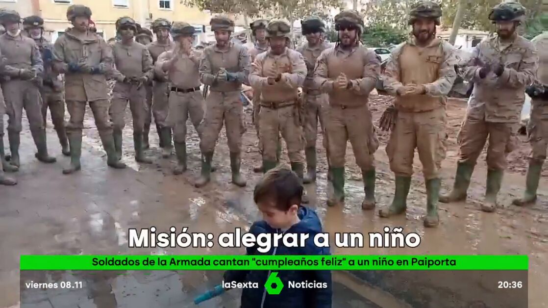 Un grupo de soldados del Cuerpo de Infantería de Marina han interrumpido sus labores de limpieza y rescate en Paiporta (Valencia) durante unos minutos para cantarle el cumpleaños a un niño de la localidad. Posteriormente, los militares han continuado con sus trabajos, pero han dejado para la posteridad una imagen de ternura entre los restos de la tragedia vivida por la DANA.