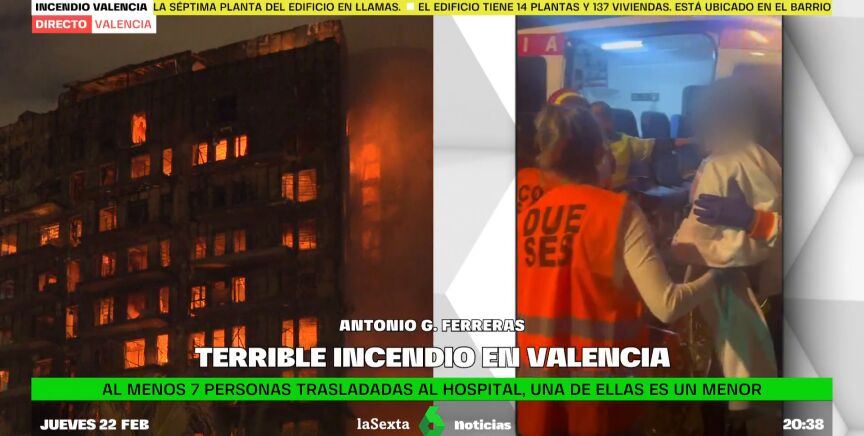 El equipo de laSexta, que se ha trasladado al barrio de Campanar, en Valencia, donde ha tenido lugar el terrible incendio, ha podido grabar cómo los heridos se subían a los vehículos de los servicios sanitarios para ingresar en hospitales de la zona.