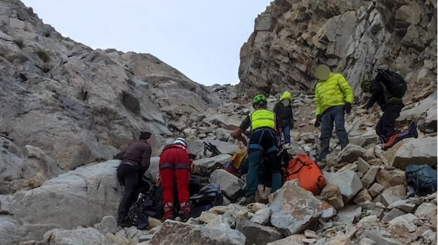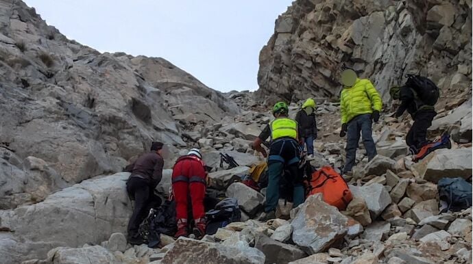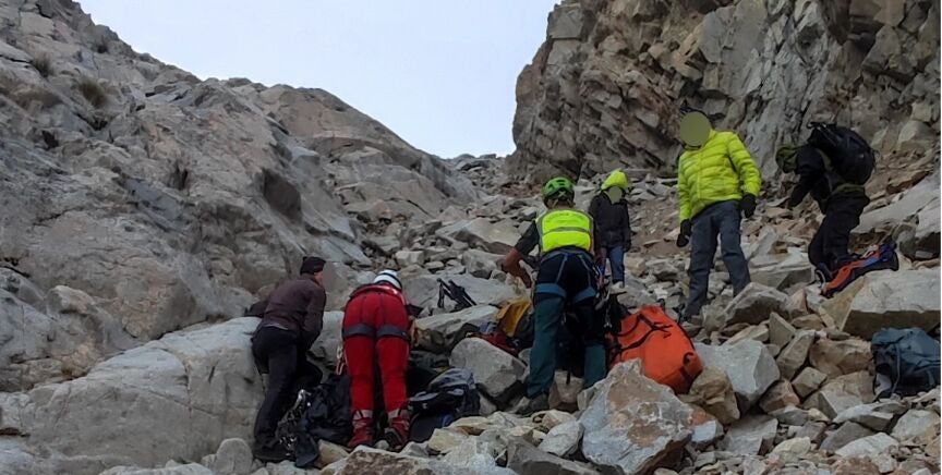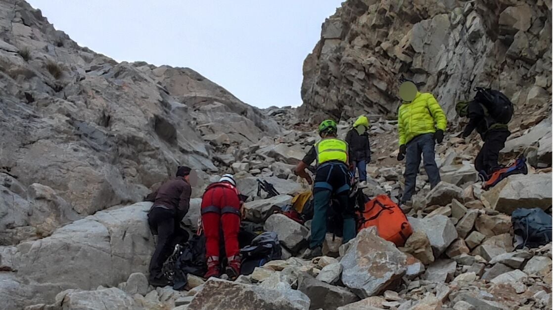 Tras descender del helicóptero, los especialistas, acompañados de un médico del servicio de Emergencias del 061, consiguieron llegar hasta la zona del desprendimiento tras atravesar con extremo cuidado un canal de roca descompuesta y de gran pendiente.