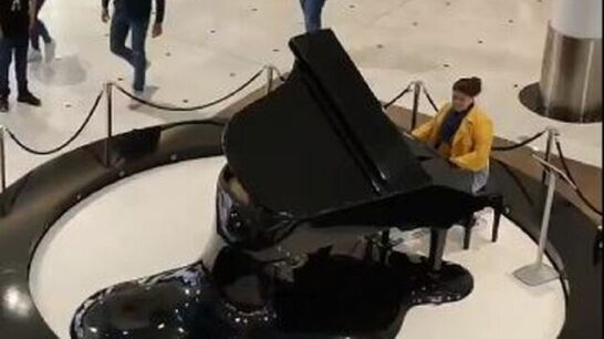 Una mujer toca el 'Cara al Sol' a piano expuesto en un centro comercial de Valladolid
