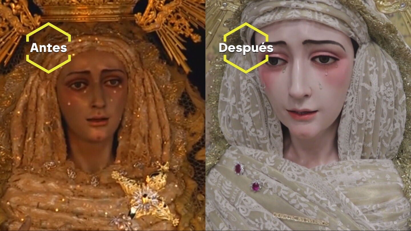 Sobre estas líneas se puede observar el antes y después de la Virgen del Dulce Nombre de Bellavista tras su restauración en 2021, que para la progenitora del escultor no se parece en nada a la que talló su padre en 1969. En este sentido, el abogado de la denunciante, Javier López-Cantal, ha explicado que "aunque se adquiera la obra de arte material, existe un derecho inmaterial que es la expresión de la idea que el autor le confirió".