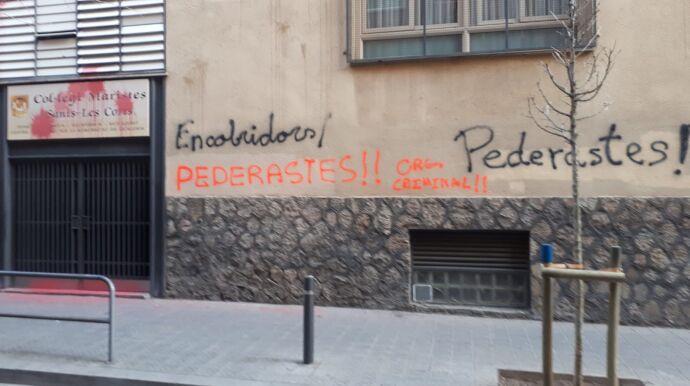 El colegio ha amanecido con pintadas de las palabras "pederastas", "encubridores" y "organización criminal". A las puertas del Palau de la Justicia también se han congregado en apoyo a las víctimas una decena de personas, que han extendido una pancarta con el mensaje "no es abuso, es violación.
