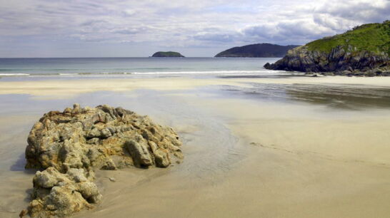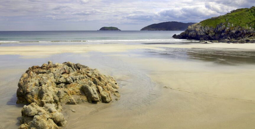 La primera que recorremos en este viaje virtual nos lleva al extremo norte de la Península. Casi en la punta de Estaca de Bares, el punto más septentrional de España, la playa de Vilela nos regala unas vistas espectaculares en las que no encontrarás muchos vecinos de toalla. Es una playa mediana de 270 metros de longitud y 30 de ancho que pertenece al municipio coruñés de Mañón. Para acceder necesitarás llegar en coche, o caminar 4 kilómetros desde O Barqueiro, la población más cercana. Y si te sale buen día, podrás disfrutar de esta arena blanca y aguas tranquilas que vemos en la foto. Estará fresca, como manda en el Cantábrico, pero no todo iba a ser perfecto.