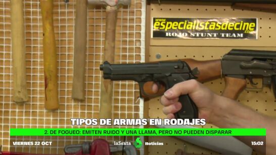 En España, la ley prohíbe llevar armamento y munición real a un rodaje. Solo hay tres tipos de armas permitidas. El primero son las simuladas, que son réplicas como las que aparecen en este vídeo, hechas de plástico, caucho o metal. Unas son macizas, sin mecanismos, y otras sí los tienen, pero simulados.
