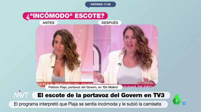 "El escote de la portavoz del Govern ha sido censurado esta mañana durante una entrevista en Els Matins -ha criticado-. En una pausa de 25 segundos para poner un vídeo le han quitado la americana y le han puesto unas agujas para subirle la camiseta. El rótulo también ha quedado más arriba", denunció la reportera. Ante esta polémica, el propio programa ha querido "aclarar" lo sucedido a través de Twitter: "Durante la entrevista con Plaja hemos resuelto en directo una situación que percibíamos incómoda para la entrevistada, porque ella misma se ajustaba el top".