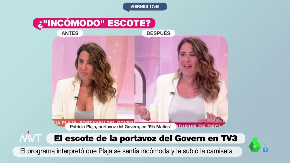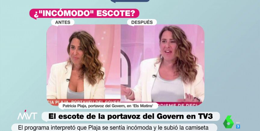 Surrealista polémica la que ha tenido lugar en un programa de la cadena de televisión catalana TV3. Sucedió durante una entrevista que la portavoz del Govern de la Generalitat, Patrícia Plaja, concedió a 'Els Matins'. Una colaboradora del programa y otras periodistas en las redes sociales denunciaron que el escote de la representante del gobierno catalán había sido "censurado", algo que ha negado el programa de televisión. Fue pasada la entrevista, y en otro bloque posterior del programa, cuando la periodista Mayka Navarro intervino para "reivindicar el escote" de Plaja.
