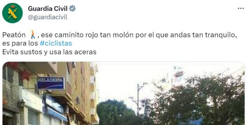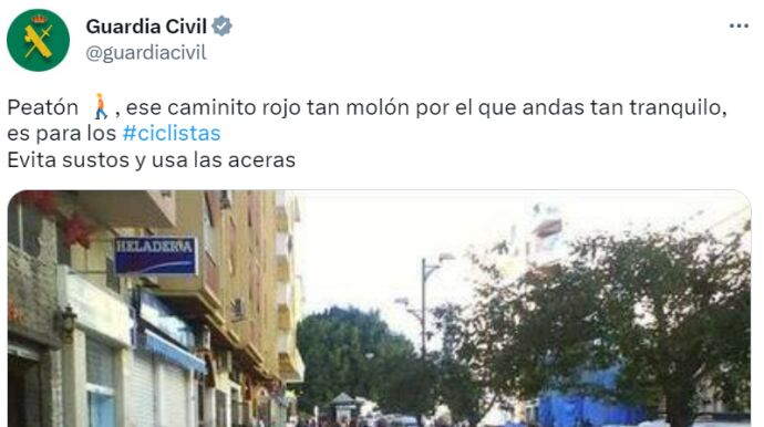 "Peatón, ese caminito rojo tan molón por el que andas tan tranquilo, es para los #ciclistas Evita sustos y usa las aceras", añadía en texto. Sin embargo, lejos de aplaudir las indicaciones de la Guardia Civil, los usuarios de Twitter han criticado la falta de espacio que hay para el peatón en el ejemplo utilizado.